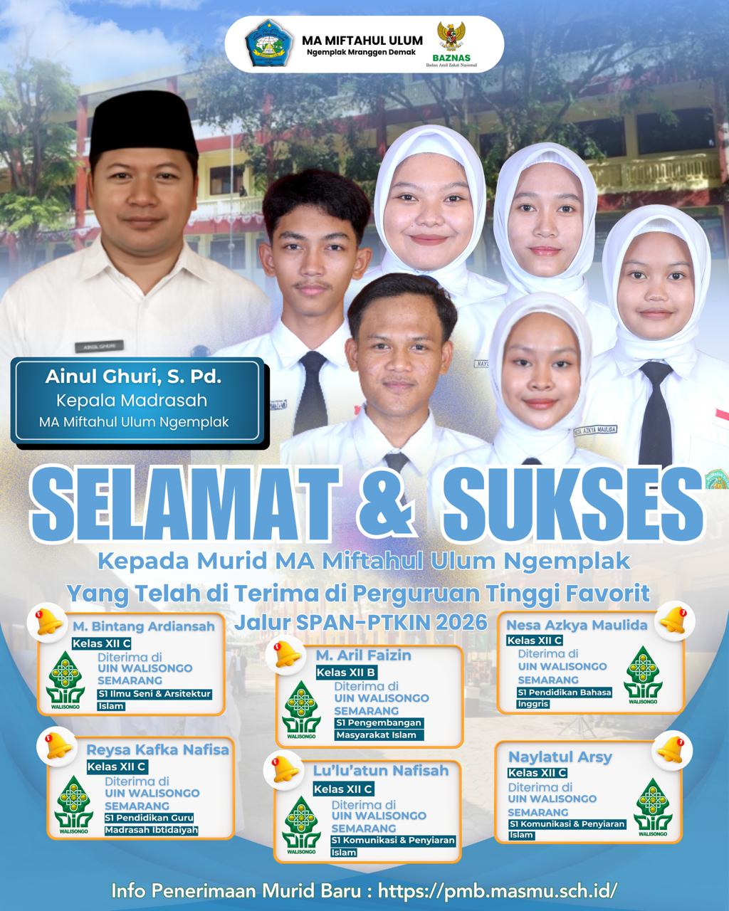 Prestasi membanggakan kembali ditorehkan oleh MA Miftahul Ulum Ngemplak dalam dunia pendidikan tinggi. Pada tahun 2026, sejumlah siswa terbaik berhasil lolos Seleksi Prestasi Akademik Nasional Perguruan Tinggi Keagamaan Islam Negeri (SPAN-PTKIN) dan diterima di perguruan tinggi favorit, khususnya di UIN Walisongo Semarang. Capaian ini menjadi bukti nyata kualitas pembinaan akademik dan karakter yang terus dikembangkan oleh madrasah.